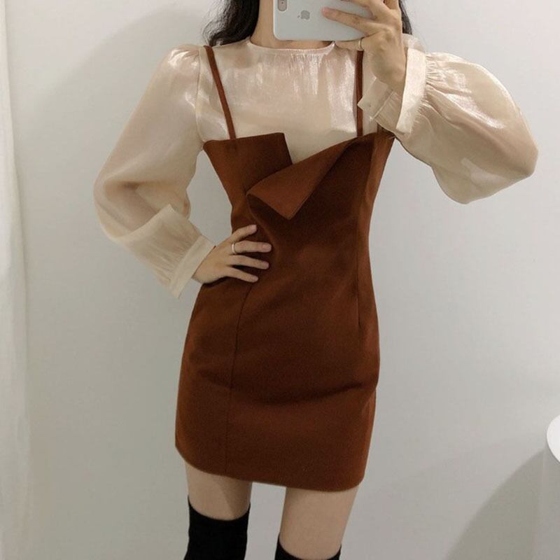 オータムウィンタースタンダードシャツ ブラックドレス レディース ロング レトロ 秋物 冬物 ICC_レディース9247746