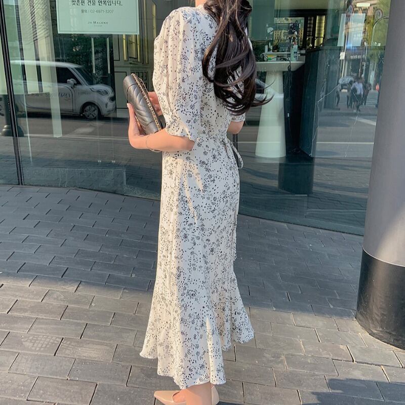 Vネックスリーブシフォンドレス サマーウェストプリントスカート レース 夏物 ICC_レディース0581561
