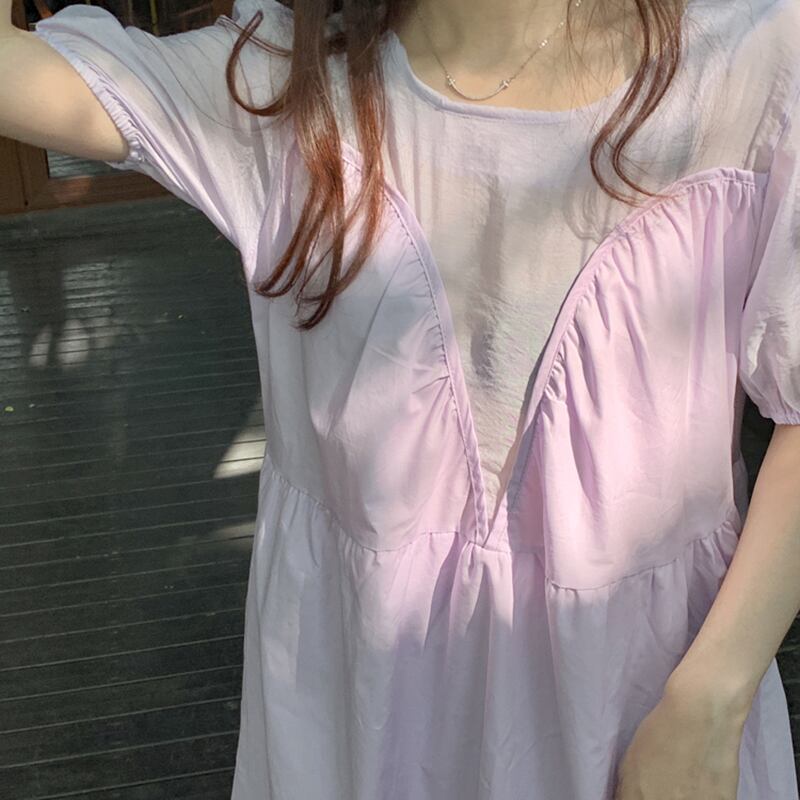 サマーホワイトラウンドネックドレス ロングスカート 夏物 Oネック パープル ステッチ ICC_レディース9231940