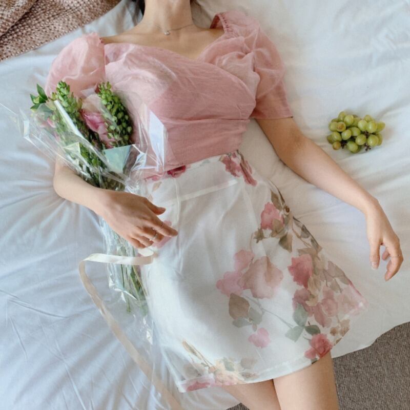 サマースリーブVネックシャツ Flowerデザイン シフォンスカート 夏物 フラワーデザイン ICC_レディース9906520