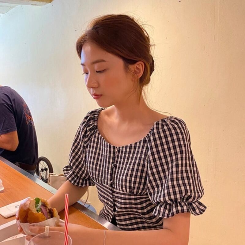 サマースタンダードブラックホワイト格子柄スリーブシャツ トップス レディース レトロ 夏物 ICC_レディース6109524