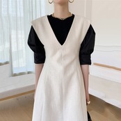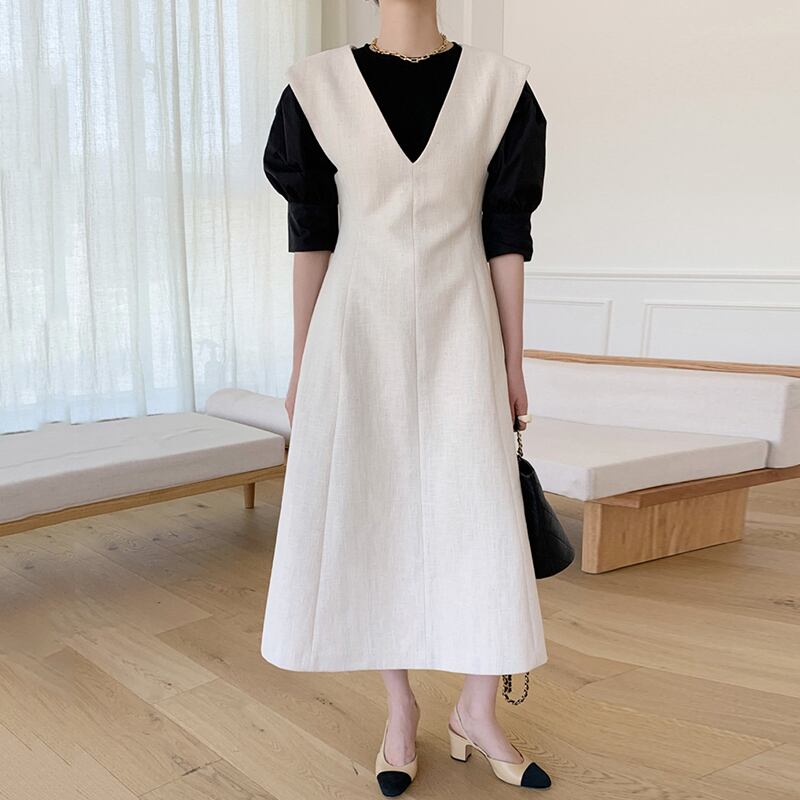 スタンダードラウンドネックルーズスリーブシャツ スリムロングAラインドレス レトロ Oネック ICC_レディース4625000