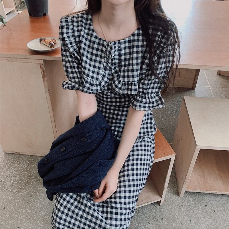 スタンダード格子柄ドレス カラースタイルウェストサマー コットン レトロ 夏物 ICC_レディース8202497