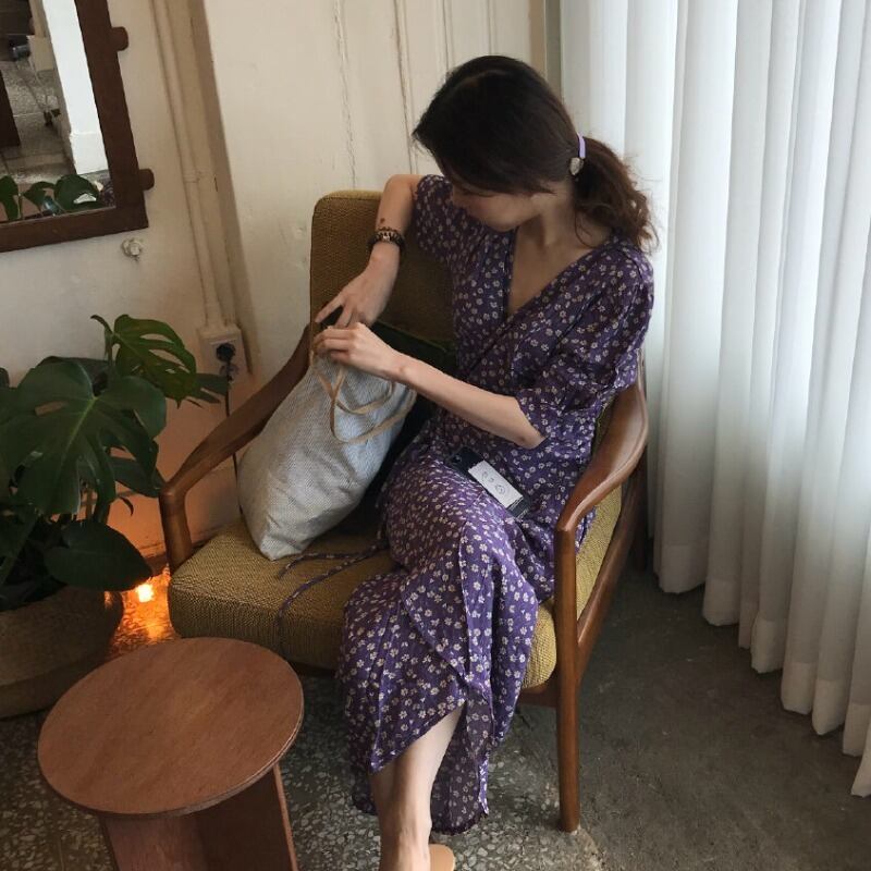 サマースタイルスタンダードフローラルVネックワンピースドレス レースウェストロング レトロ 夏物 花柄 ICC_レディース7372499