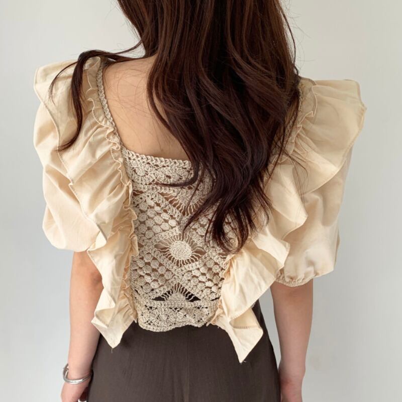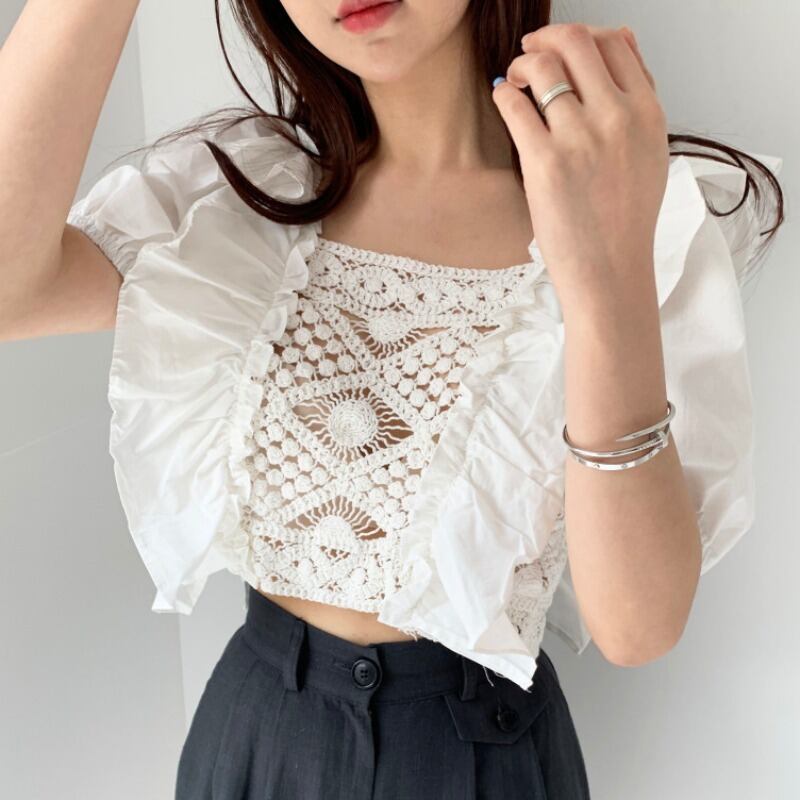 カラーレースFlowerデザイン スリーブシャツ サマー半袖 ショート ハーフスリーブ 夏物 フラワーデザイン スクウェア ICC_レディース0214199