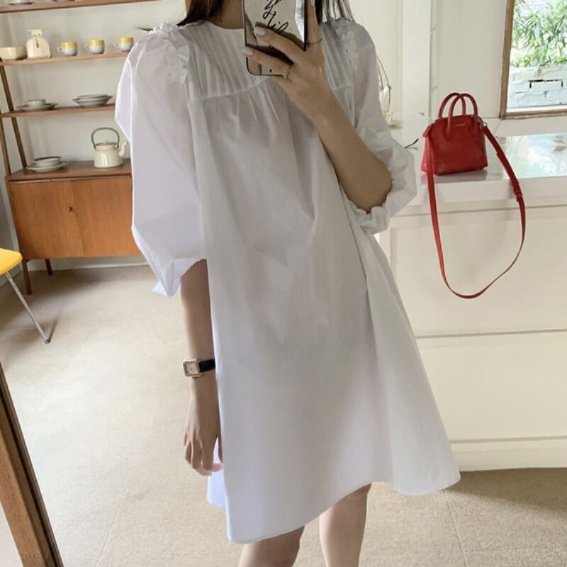 サマーラウンドネックプリーツルーズソリッド カラーカジュアルドレス スカート 夏物 Oネック ソリッドカラー ステッチ ICC_レディース8171279
