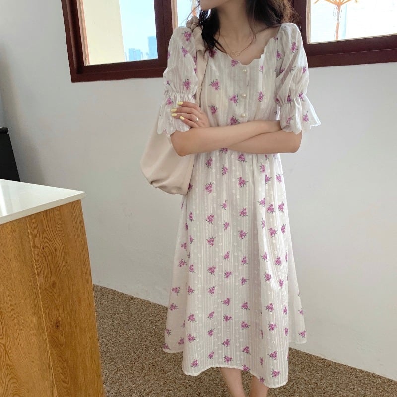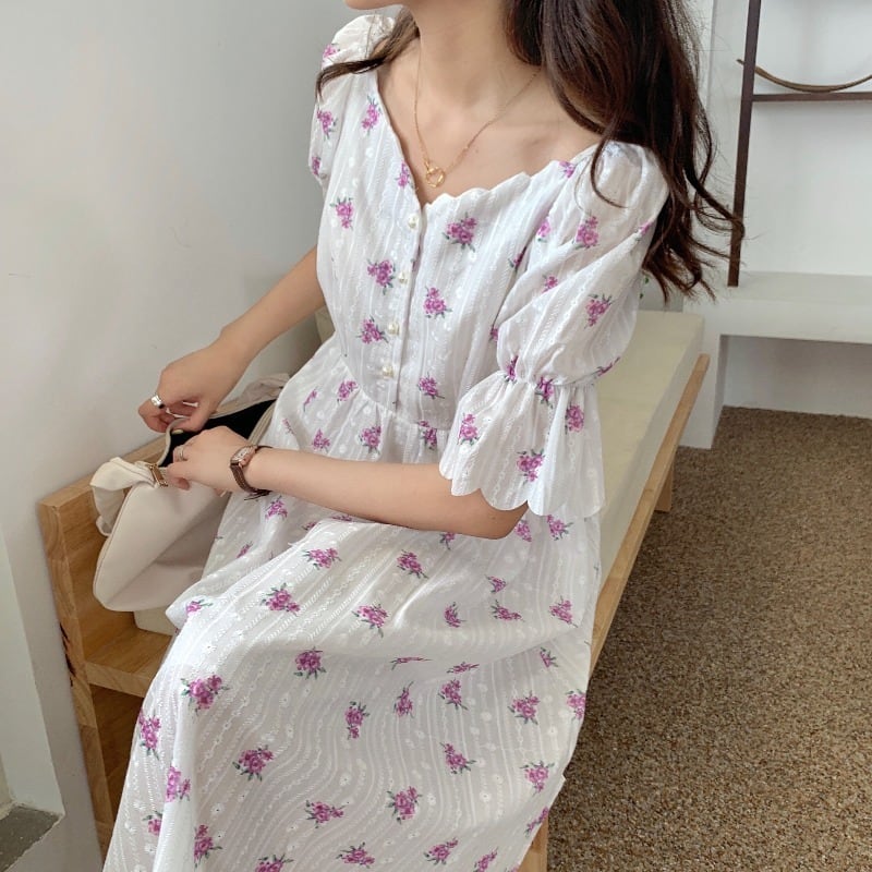 フローラル薄手Vネックシングルブレストハイウェストウェストスリーブドレス 花柄 ICC_レディース2630808