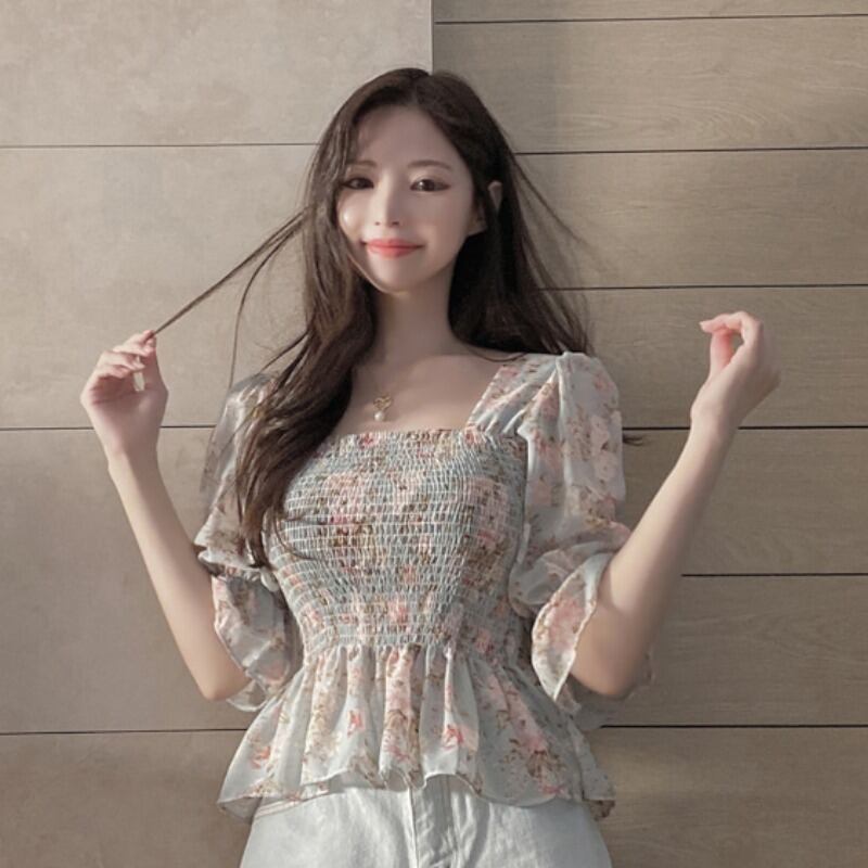 ショートシフォンフローラルトップス サマーFlowerデザイン シャツ 夏物 花柄 フラワーデザイン エメラルド 翠玉 緑玉 ICC_レディース6994286