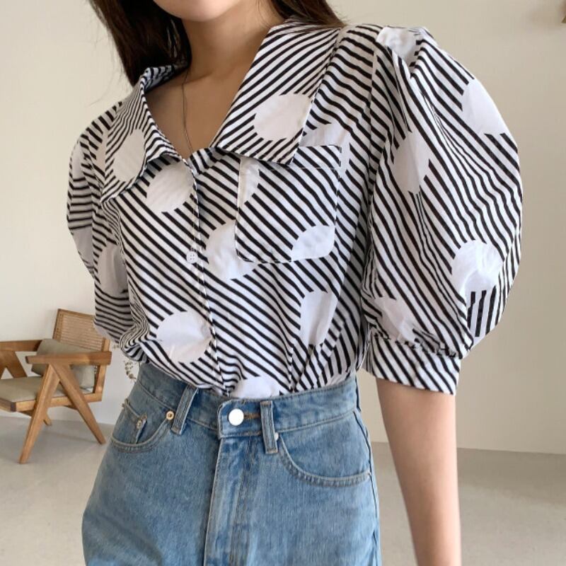 スタンダード水玉ストライプルーズスリーブシャツ レディース レトロ ICC_レディース6312442