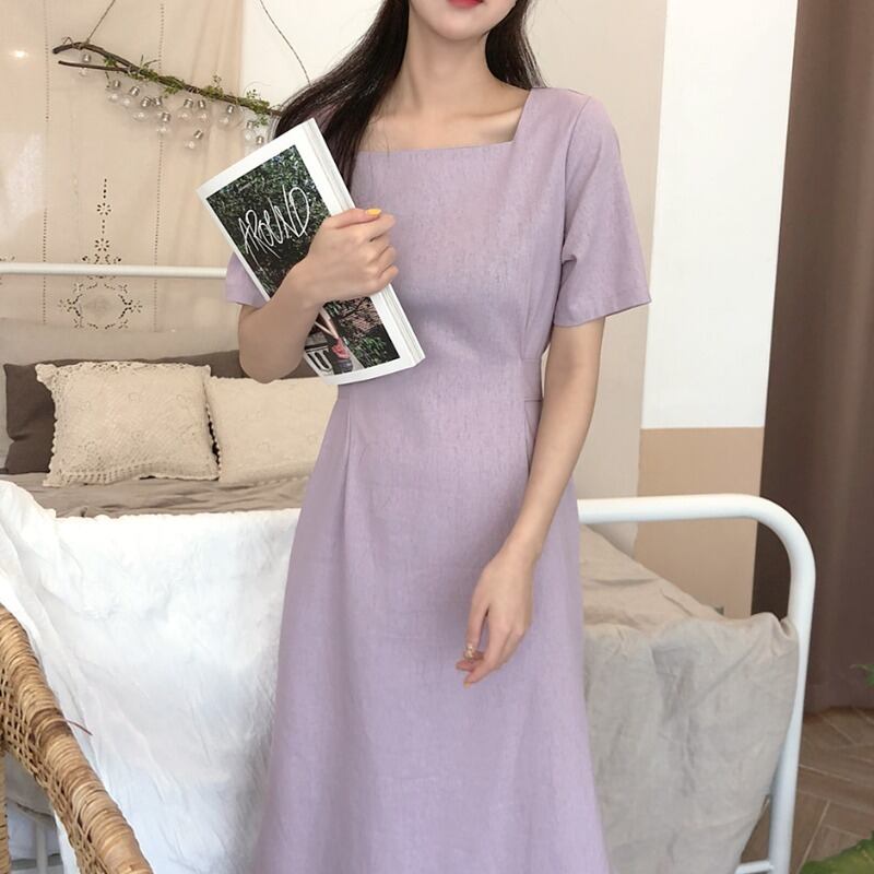 サマースタンダードカラーウェストドレス レトロ 夏物 パープル スクウェア ICC_レディース2241731