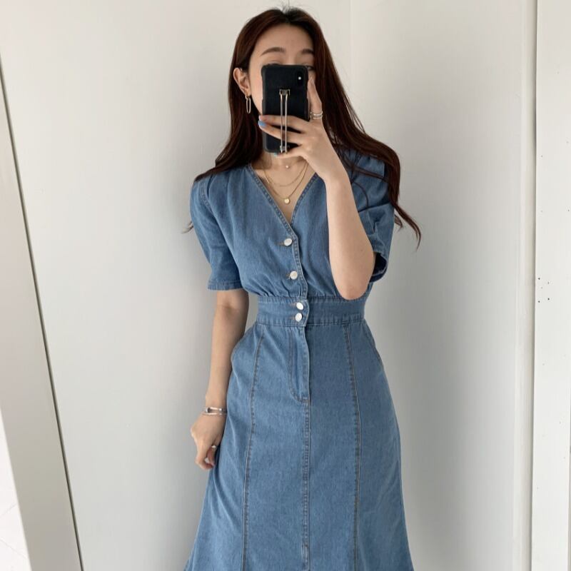 サマーVネックスリーブドレス ハイウェストウェストスタンダードスカート レトロ 夏物 ICC_レディース2205484