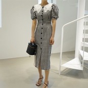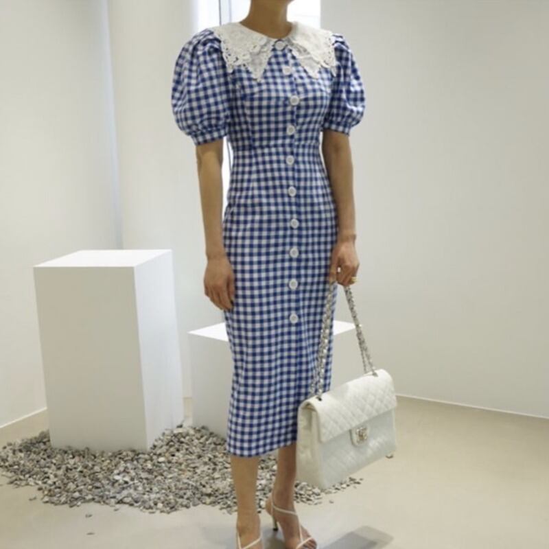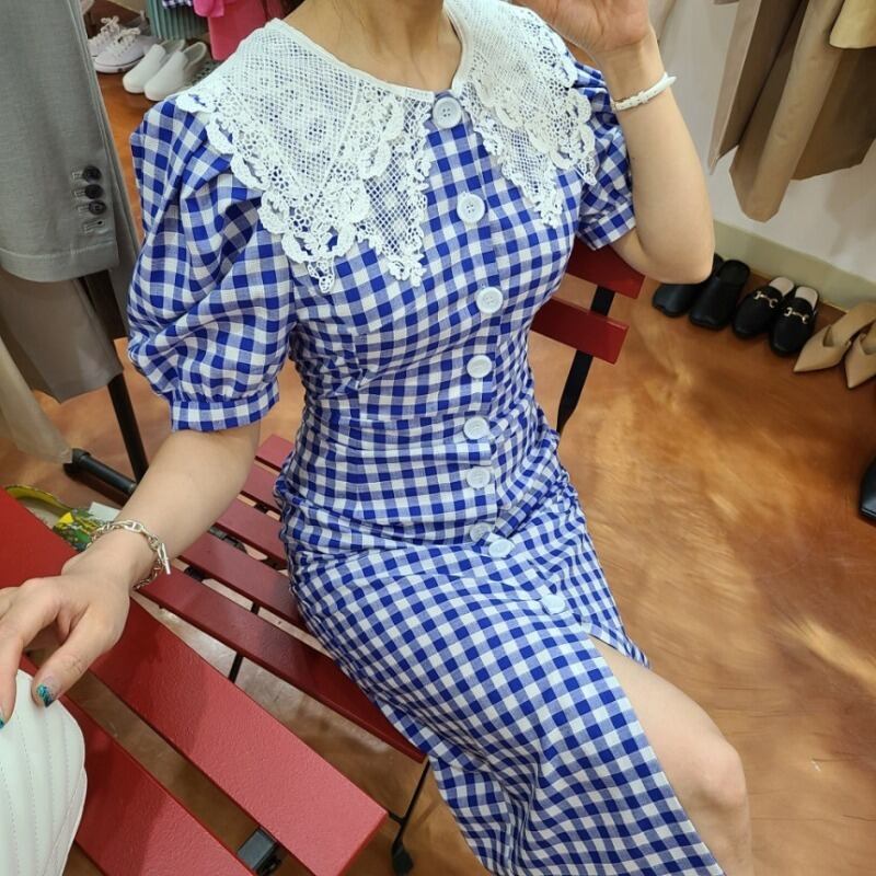 サマーレースカラーウェストスリーブ格子柄ドレス 夏物 ICC_レディース8587391
