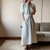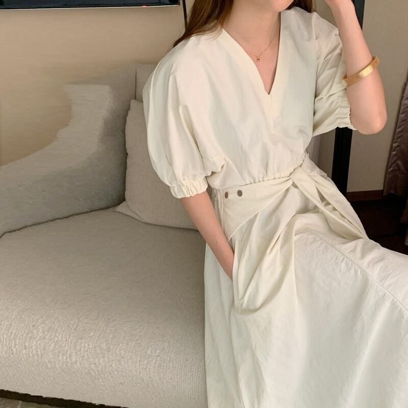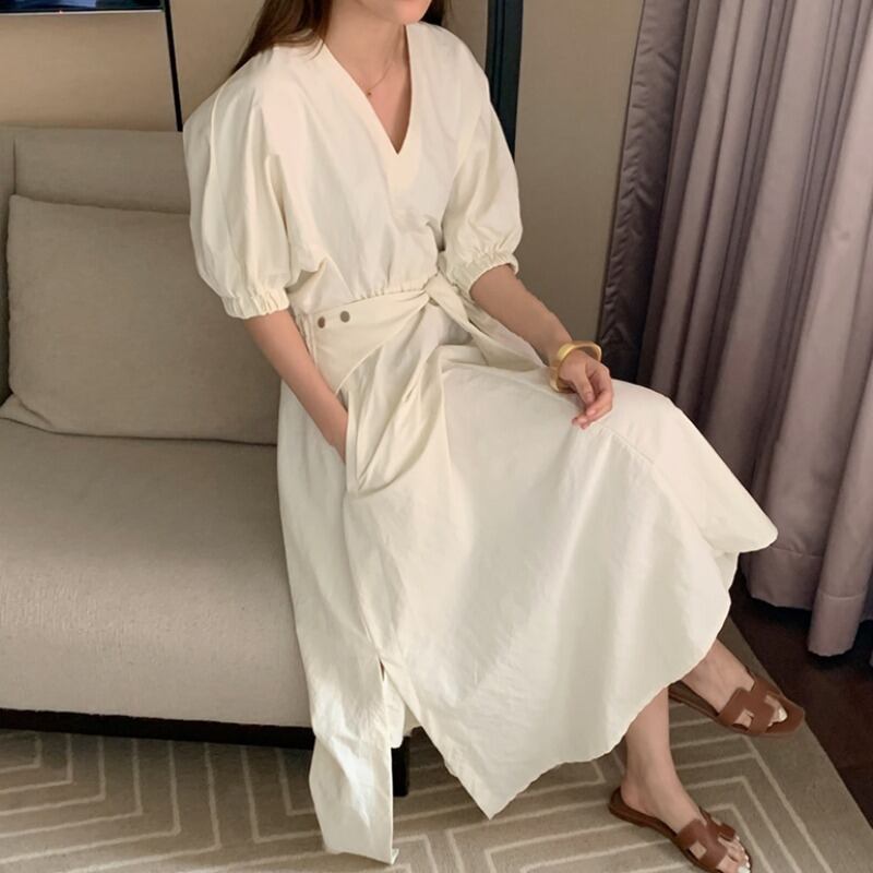 スタンダードVネック薄手ハイウェストウェストドレス ロングスカート レトロ ICC_レディース7894700