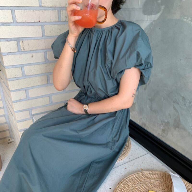 スタンダードラウンドネックプリーツレースウェストルーズスリーブドレス ロングスカート レトロ Oネック レースアップ ICC_レディース2531143