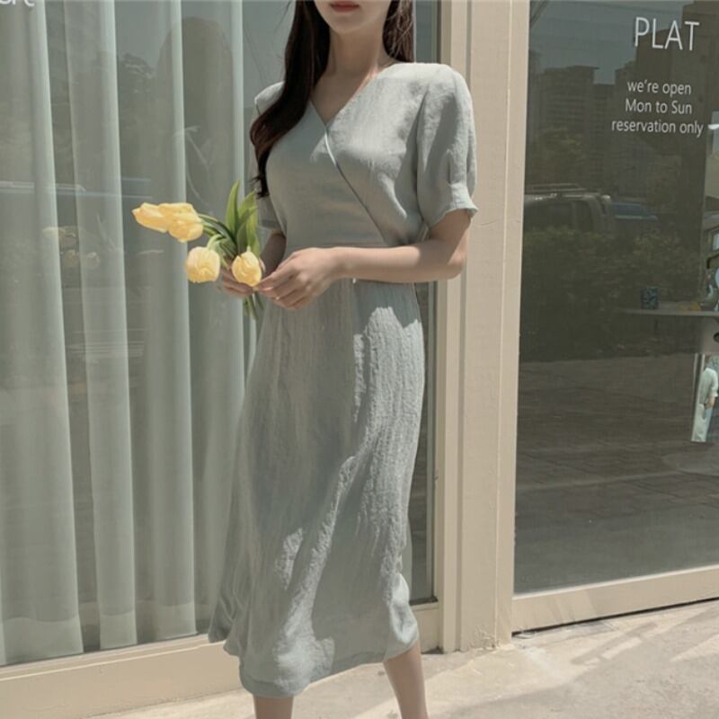 スタンダードスタイルウェストVネックドレス サマー コットン レトロ 夏物 ICC_レディース4751495