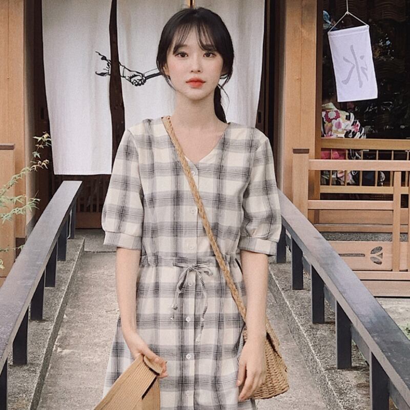 サマースタンダードウェストギャザーVネック格子柄ドレス レトロ 夏物 ICC_レディース7532392