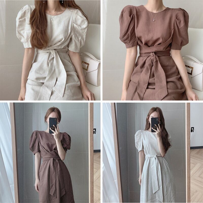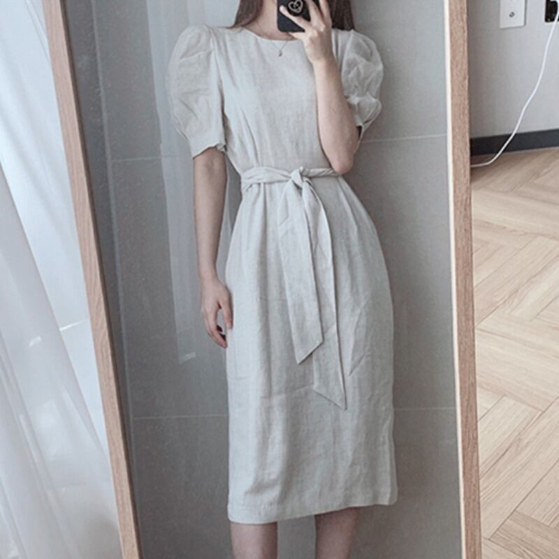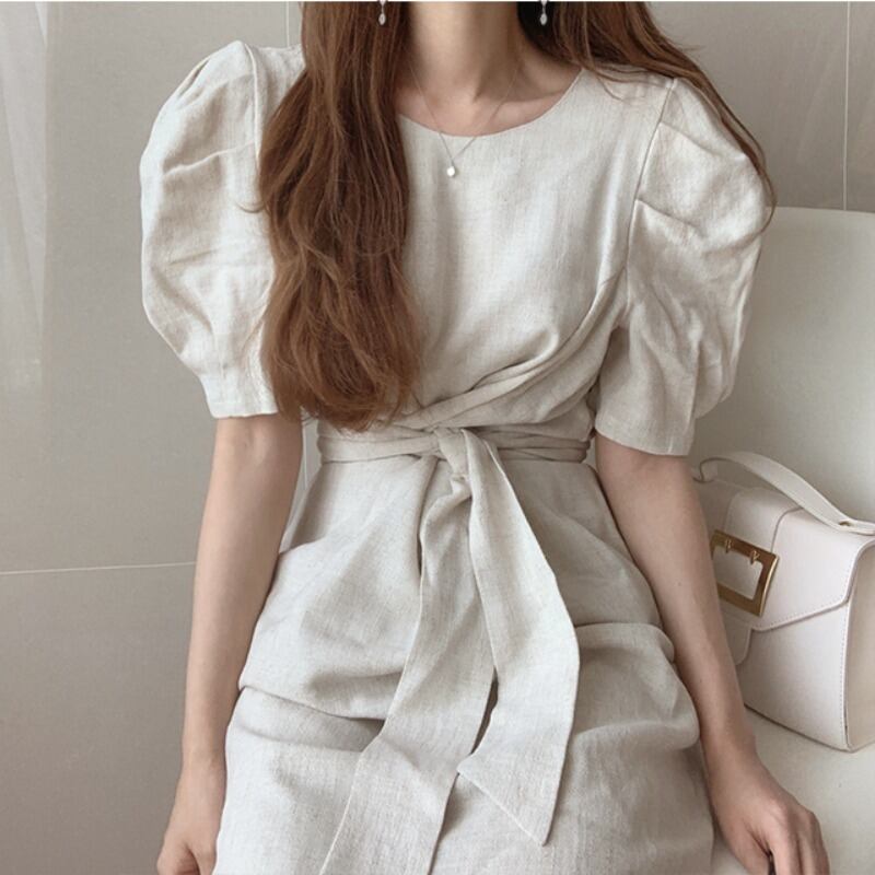 クロスストラップ ウェストスタンダードスリーブドレス コットン レトロ エレガント ICC_レディース9695275