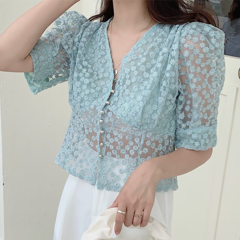 Flowerデザイン レースシャツ サマーVネックウェストスリムトップス 夏物 フラワーデザイン ICC_レディース2000899