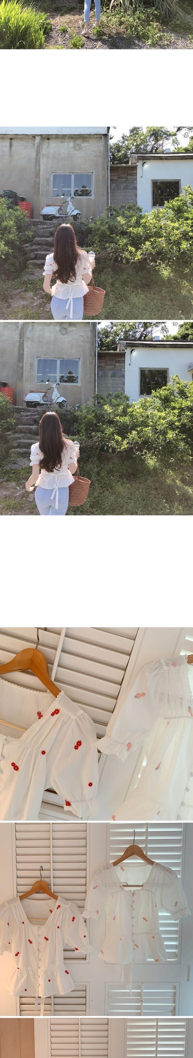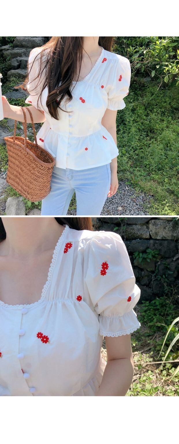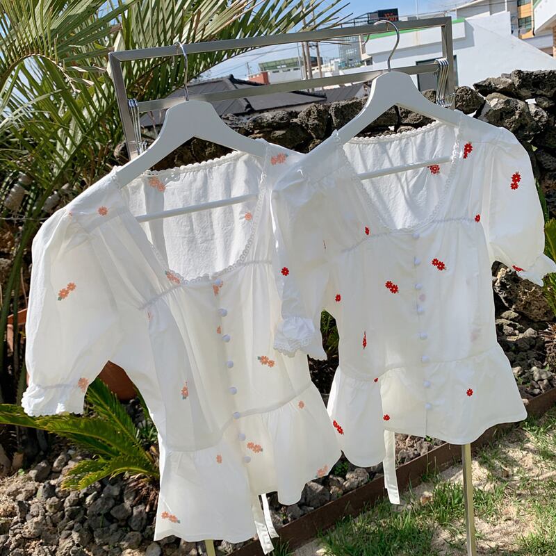 サマースタンダードシャツ ウェストスリーブカラー レッド レトロ 刺繍 大人ガーリー スウィート キュート カジュアル 夏物 スクウェア 左左右右4475454