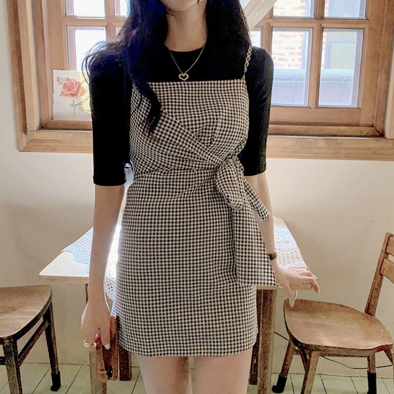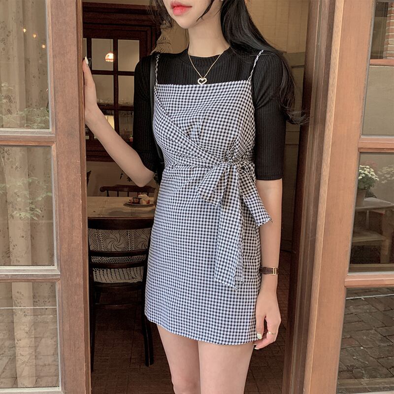 サマースタンダードスカート ショートウェスト格子柄ドレス レトロ 夏物 フラワーデザイン 左左右右8736912