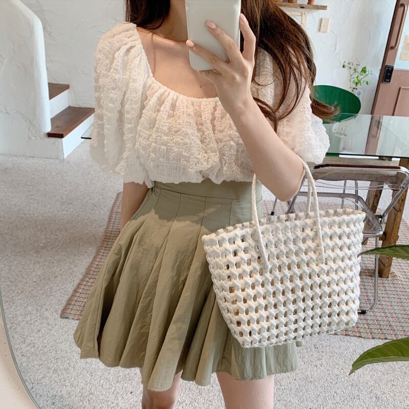 カラースリーブトップス ソリッド ハイウェストウェストスカート ソリッドカラー スクウェア ICC_レディース5707855
