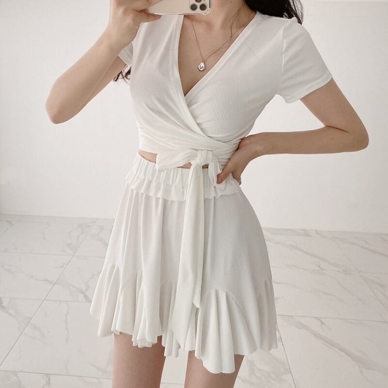 VネックウェストTシャツ プリーツスカート レース 大人ガーリー スウィート キュート カジュアル レースアップ ICC_レディース9322234