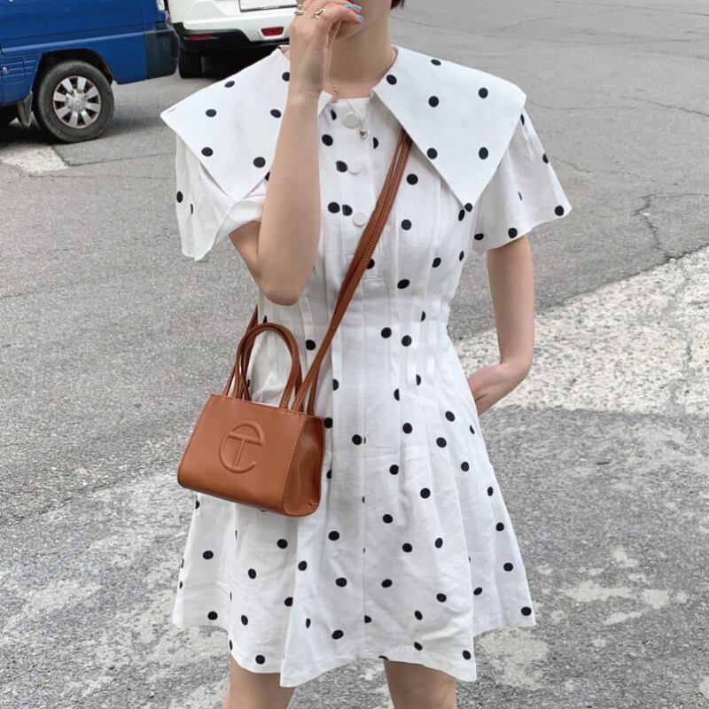 スタンダードカラーウェスト水玉ドレス レトロ 大人ガーリー スウィート キュート カジュアル ICC_レディース2887470