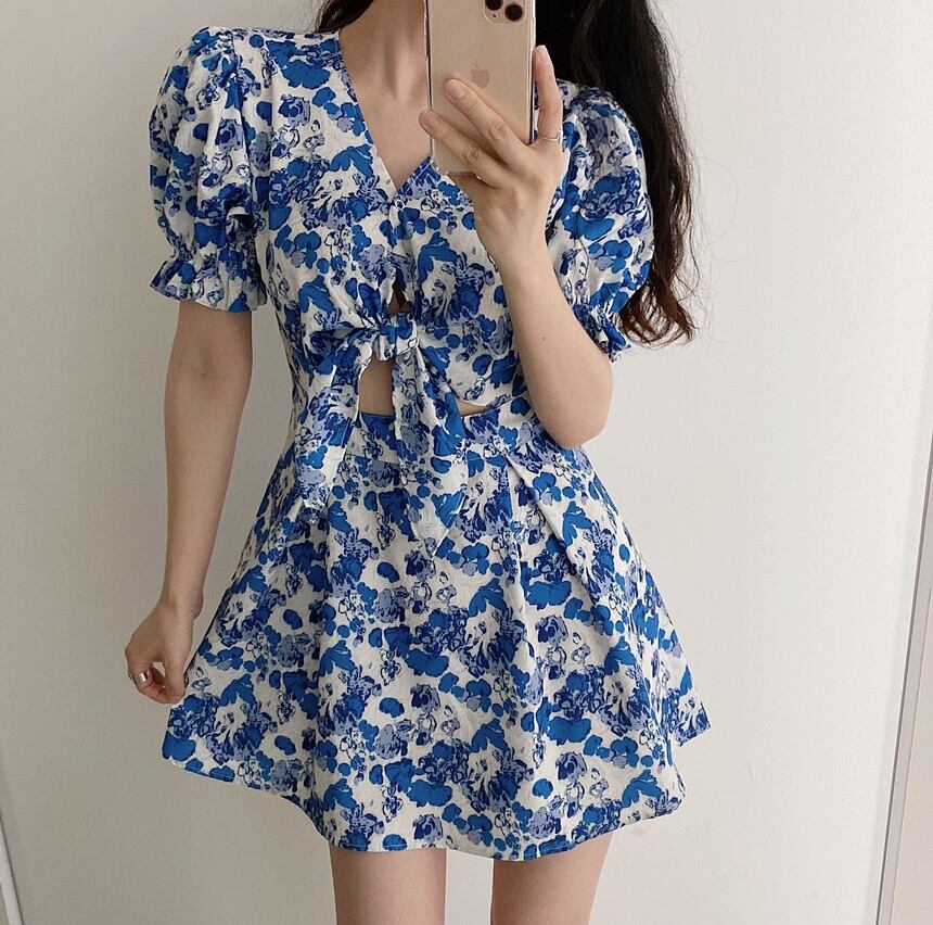 スタンダードウェストVネックフローラルドレス レトロ 大人ガーリー スウィート キュート カジュアル 花柄 ICC_レディース1713948