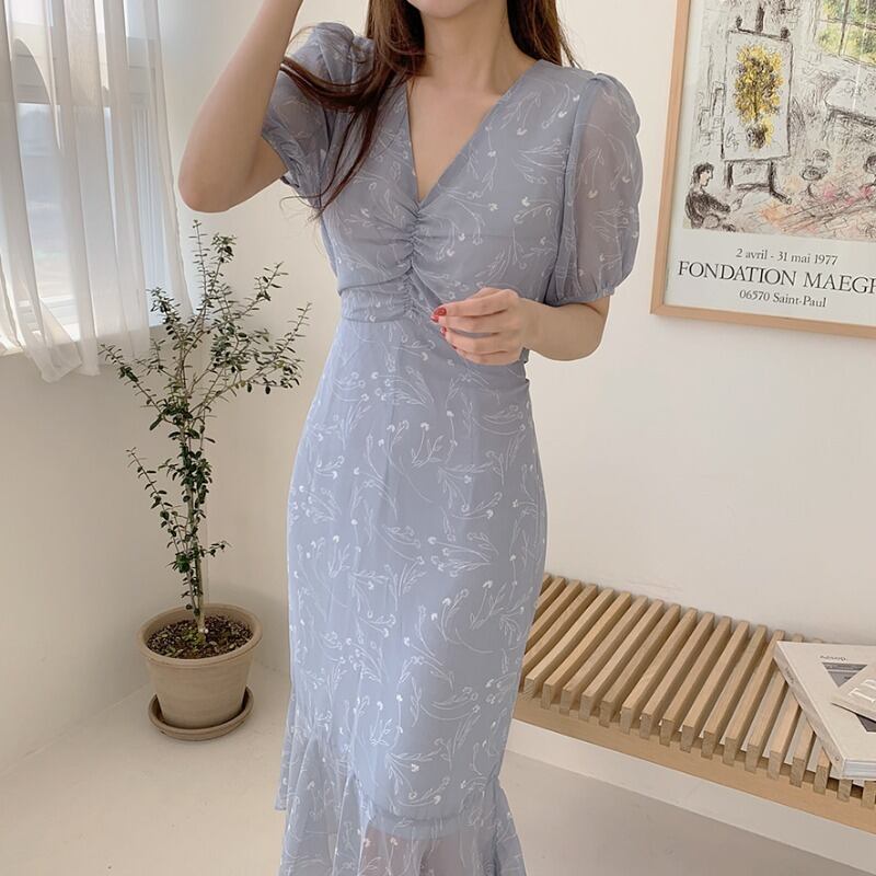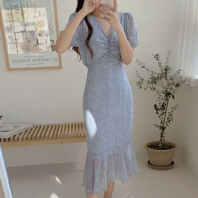 サマーVネックプリント柄半袖スリーブウェストドレス ショート ハーフスリーブ 大人ガーリー スウィート キュート カジュアル 夏物 ICC_レディース4376191