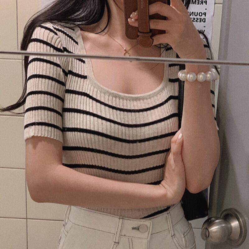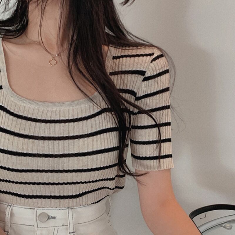 スタイル薄手カラースリムストライプセーター Tシャツ スクウェア ICC_レディース2200143