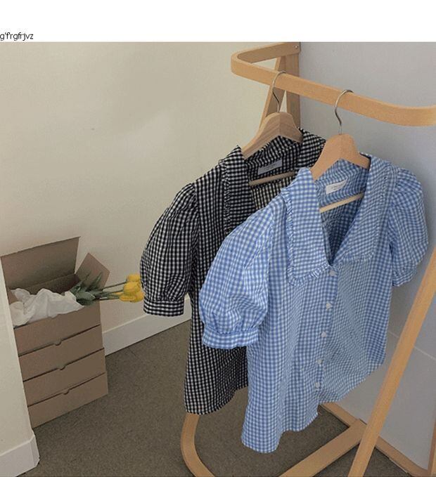 サマースタイルスタンダードブラウス シャツ カラー格子柄 レトロ 大人ガーリー スウィート キュート カジュアル 夏物 左左右右0154419