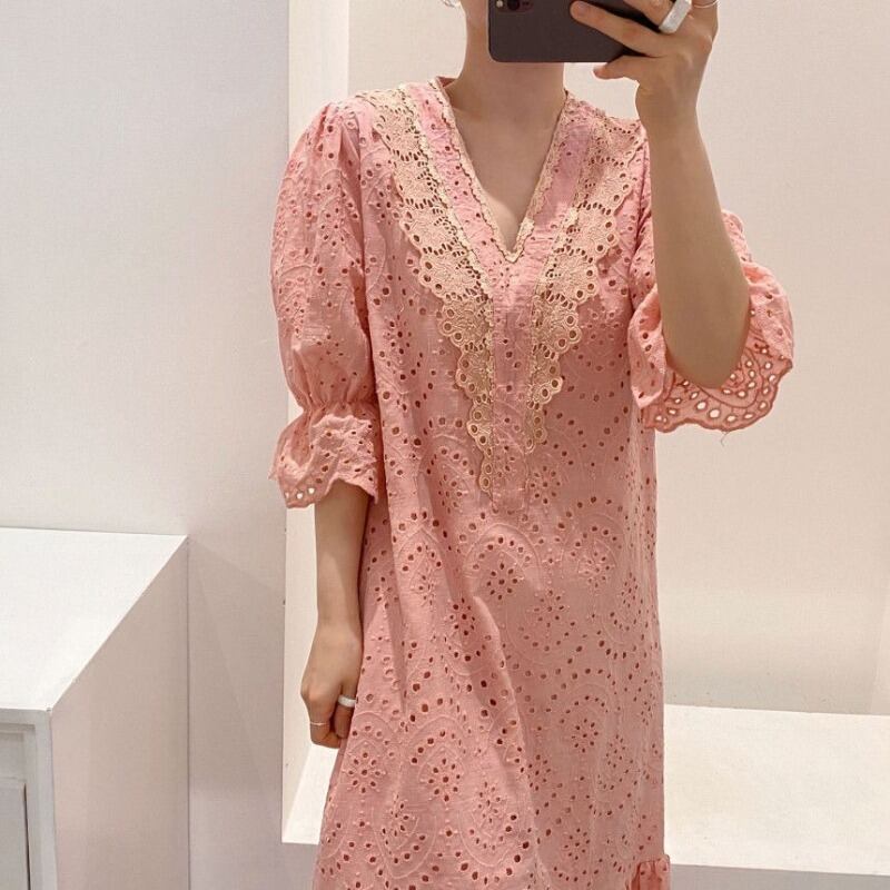 サマースタンダードFlowerデザイン レースドレス ルーズスリーブロングスカート レトロ 大人ガーリー スウィート キュート カジュアル 夏物 フラワーデザイン ICC_レディース4489068