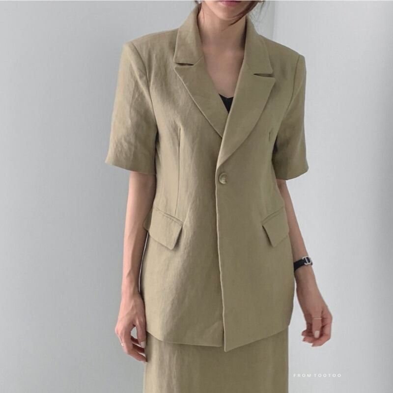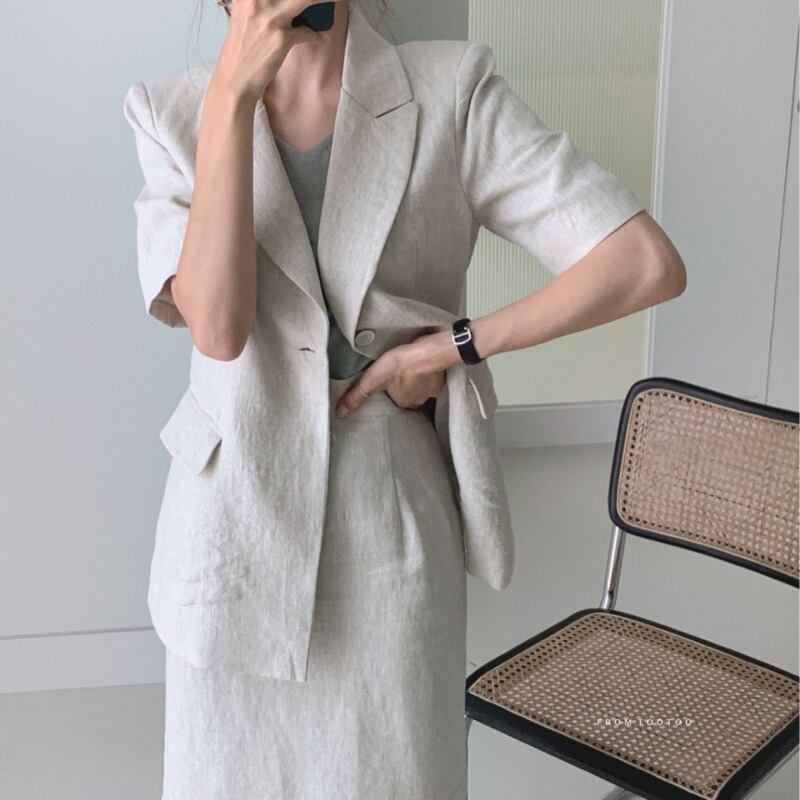 サマー半袖スリーブボタンジャケット スカート レッド ショート ハーフスリーブ 夏物 ICC_レディース8618293