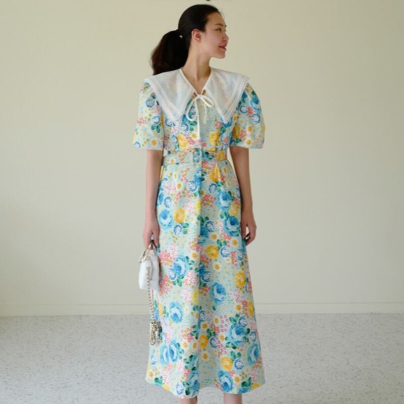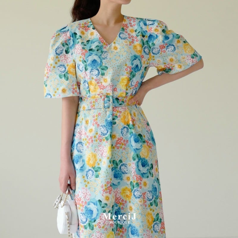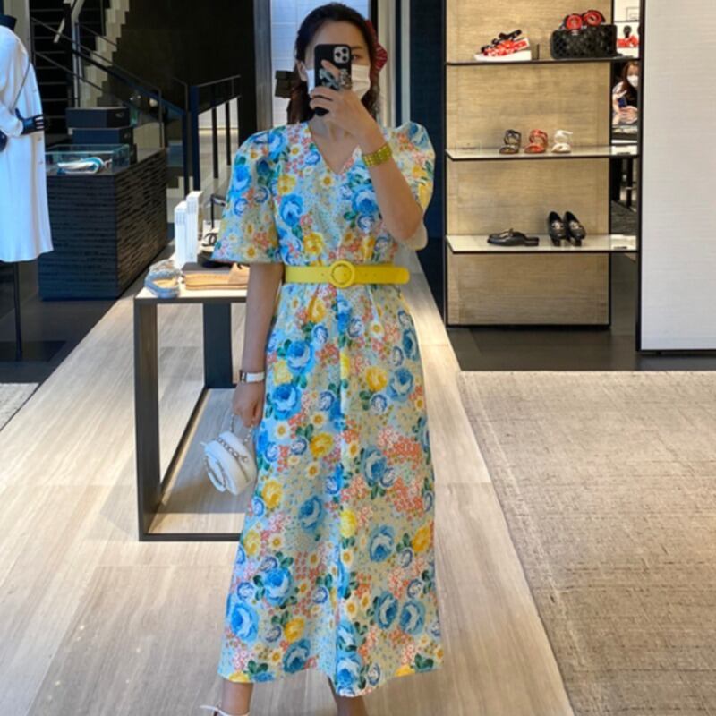 サマーカラーFlowerデザイン Vネックドレス 夏物 フラワーデザイン ICC_レディース0830371