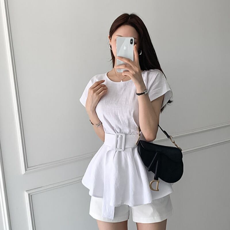 サマーラウンドネックウェストスリムスリーブトップス ハイウェストフィットショーツ レディース レース 夏物 ブルマー Oネック レースアップ ICC_レディース0478315