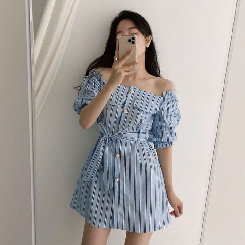 サマーロングスカート スタンダードカラーストライプウェストドレス レトロ 夏物 スクウェア ICC_レディース4118009