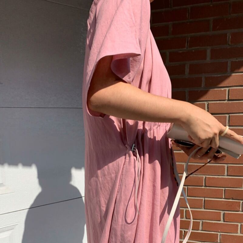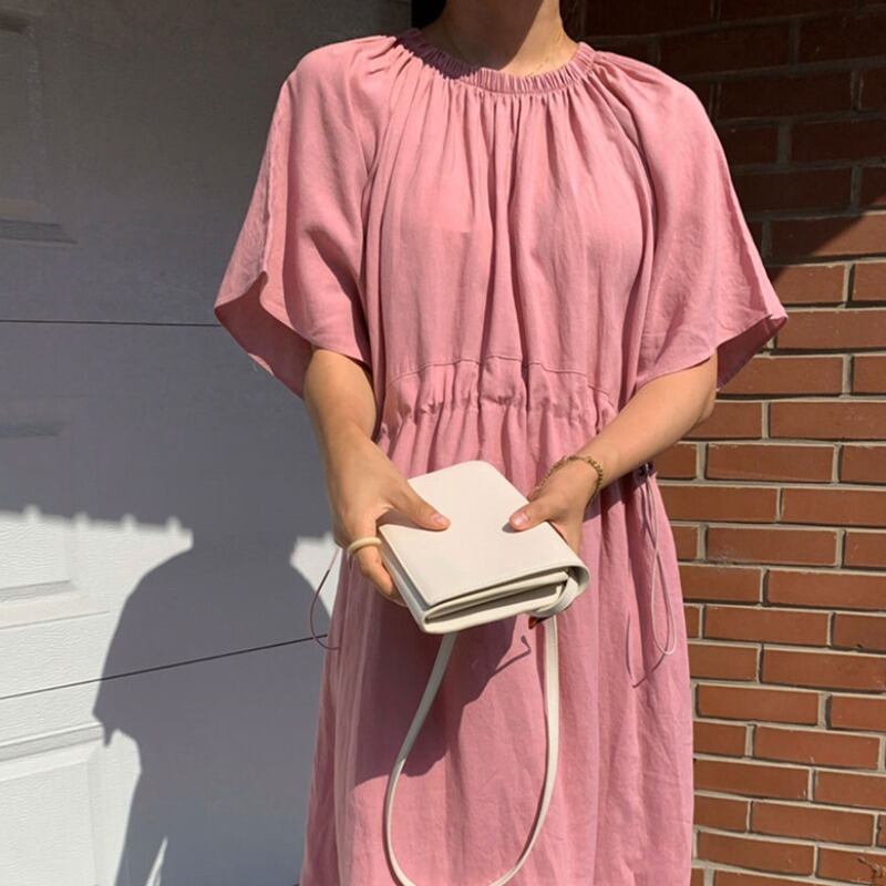 サマースタンダードラウンドネックギャザーウェストルーズロングドレス レトロ 夏物 Oネック ICC_レディース9397779