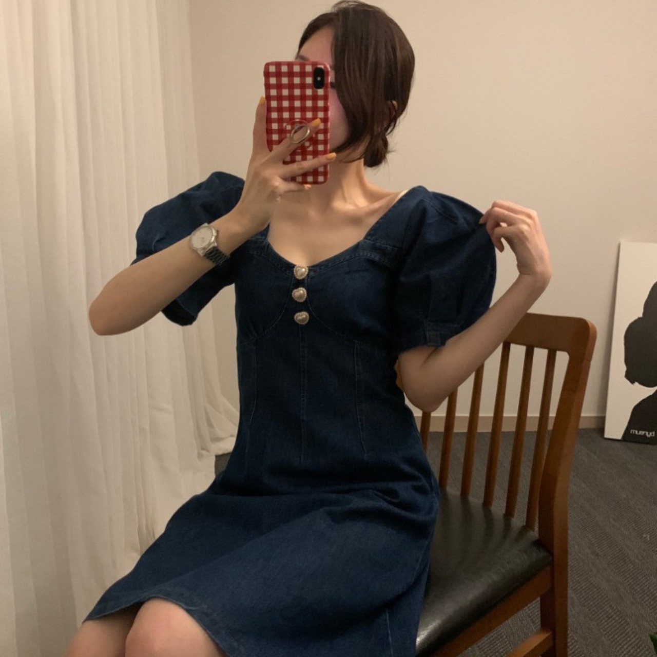 サマースタンダードカラースリーブハイウェストウェストAライン薄手ドレス レトロ 夏物 スクウェア ICC_レディース5499465