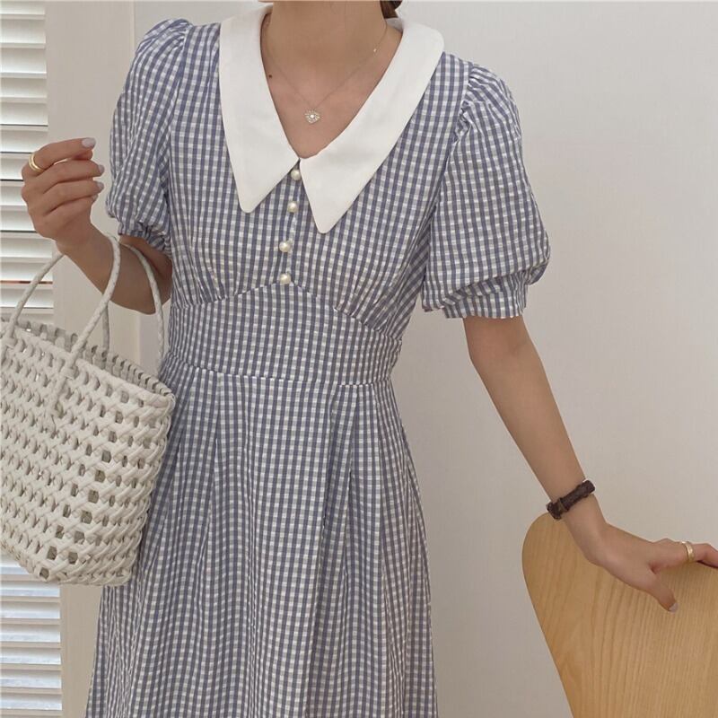 サマースタンダードカラーパールバックルVネックウェスト格子柄ドレス レトロ 夏物 真珠 ICC_レディース6216487