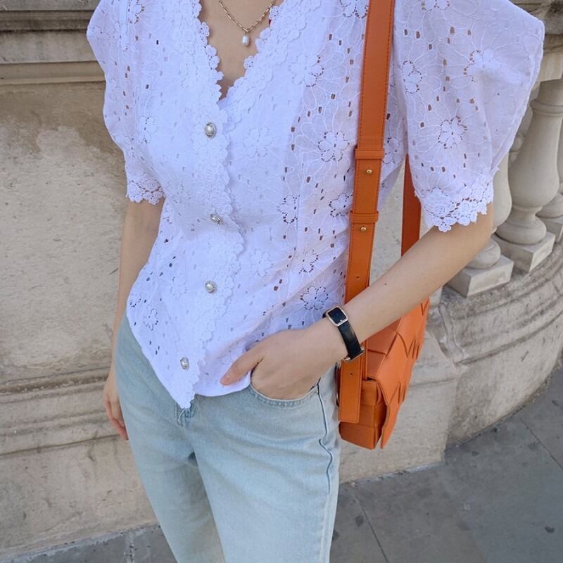 サマースリーブFlowerデザイン シャツ Vネックトップス 夏物 フラワーデザイン ICC_レディース2907638