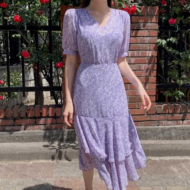 スタンダードVネックフローラルシフォンドレス ウェスト薄手サマーロング レトロ 夏物 花柄 パープル ICC_レディース8753434