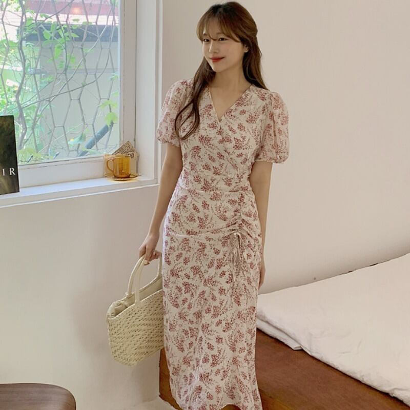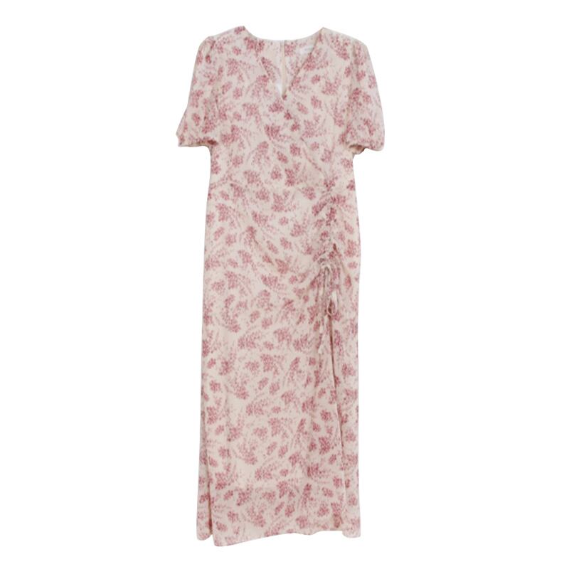 サマースタンダードシフォンフローラルドレス Vネックウェスト薄手ロング レトロ 夏物 花柄 ICC_レディース4948637