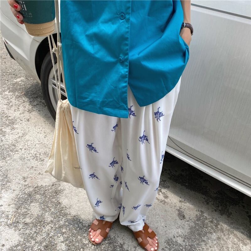 スタンダードルーズシャツ ハイウェストウェスト薄手プリントワイドレッグ レトロ ワイドパンツ ICC_レディース7359882