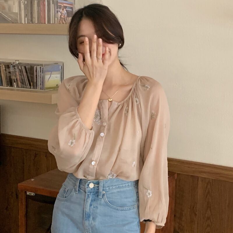スリーブトップス サマー刺繍スタンダードルーズシフォンシャツ ランタンスリーブ レトロ 夏物 ICC_レディース6123063