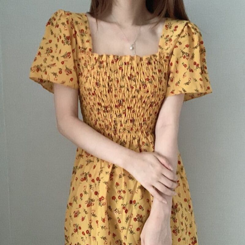 スカート サマーカラーウェストロングドレス エラスティック 伸縮 エレガント 夏物 フラワーデザイン スクウェア ICC_レディース1941334