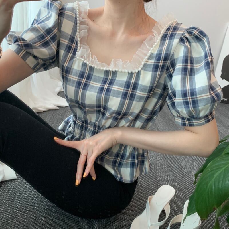 スタンダードカラーパールスリーブショート格子柄シャツ トップス レトロ 真珠 スクウェア ステッチ ICC_レディース8393154
