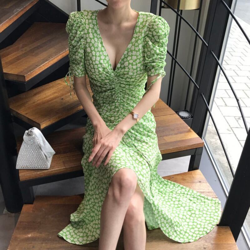 フローラルVネック薄手プリーツウェストスリムスリーブドレス 花柄 ICC_レディース1480121