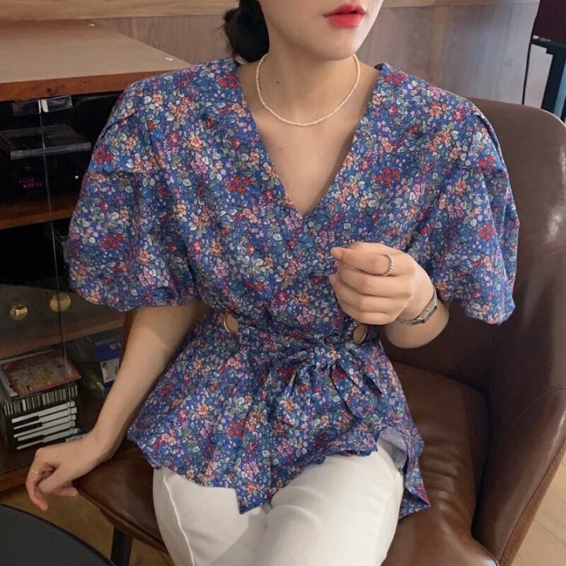 サマースタイルスタンダードVネックフローラルスリーブストラップ ウェストシャツ レトロ レース 夏物 花柄 ICC_レディース5529034