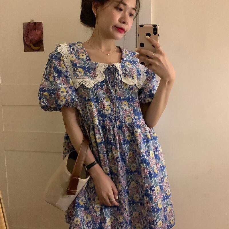 フローラルレーススリーブルーズスリムドレス 大人ガーリー スウィート キュート カジュアル 花柄 ステッチ ICC_レディース7795841