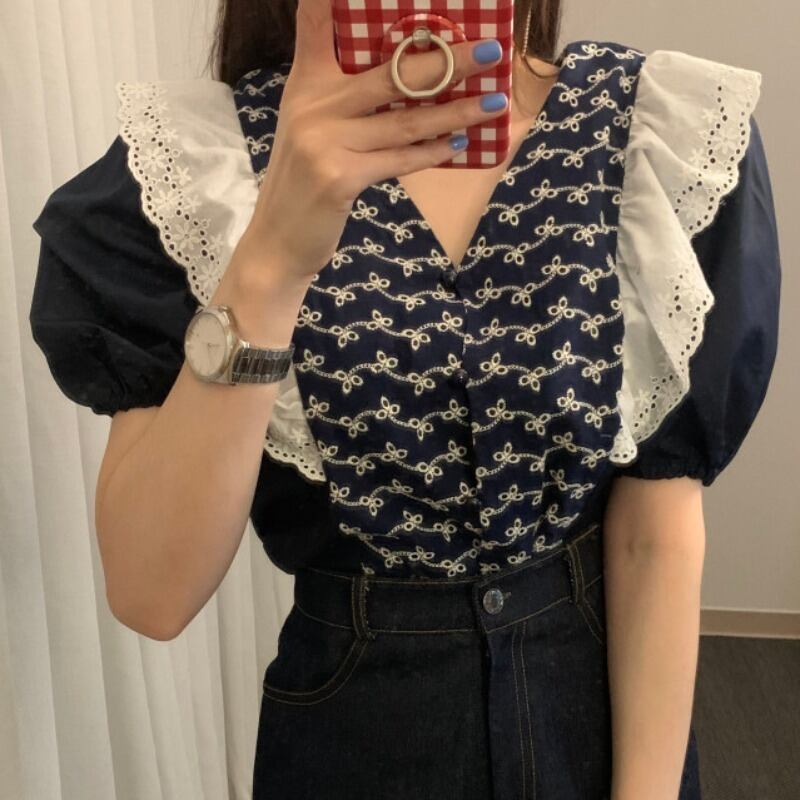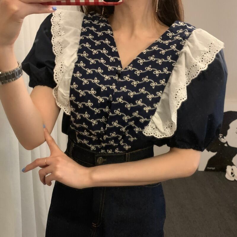 スタンダード刺繍レースVネック半袖スリーブシャツ レディース ショート レトロ ハーフスリーブ ステッチ ICC_レディース0766368